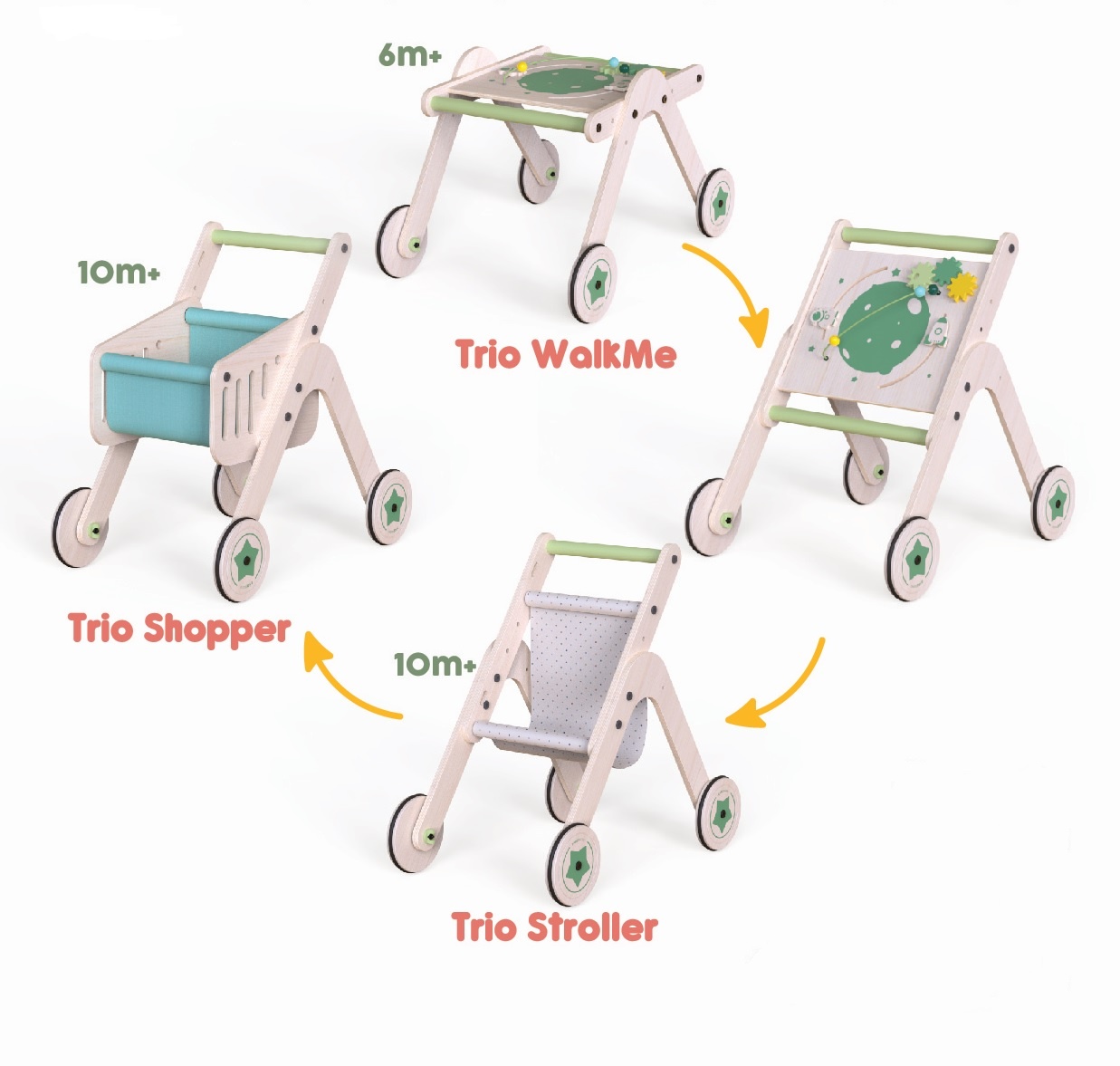 Functii multiple: este o combinatie de mai multe jucarii avand mai multe functii: premergator, masuta de activitati, carucior de papausi sau carucior de cumparaturi cu mai multe jocuri printre care margele pe sarma, roti dintate care se invart sau primele notiuni despre spatiu si rachete.