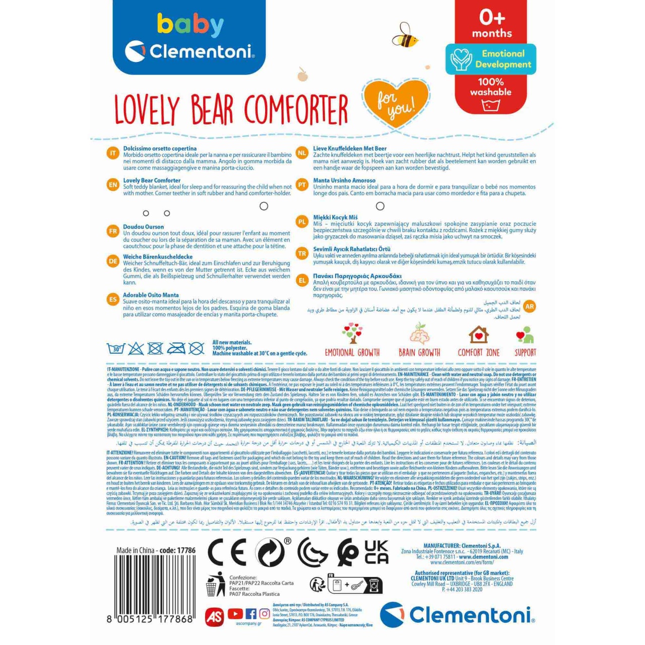 O paturica insotita de un ursulet foarte dragut pe care sa le porti mereu cu tine si sa simti mirosul mamei chiar si atunci cand ea nu este acolo. Una dintre labutele ursuletului se transforma intr-un suport practic pentru suzete. Mama va putea sa isi "lase" propriul miros pe animalutul de plus, care il va insoti pe copil pe tot parcursul zilei, devenind cel mai bun prieten de somn si de joaca. Alegerea tesaturilor este rezultatul unei cercetari atente, pentru a garanta cea mai buna calitate si siguranta in timpul desfasurarii jocului. 100% lavabil la masina de spalat O lume care trebuie descoperita Timpul petrecut la joaca este esential pentru dezvoltarea celui mic. Fiecare moment plin de distractie reprezinta pentru copilul tau noi invatari, descoperiri si abilitati. Jucariile baby Clementoni ii vor ajuta pe copii sa invete in timp ce se distreaza, favorizand cresterea lor prin folosirea unui limbaj natural pe care il cunosc: jocul. Zornaitoare, jucarii interactive si multe altele va asteapta sa le descoperiti! Caracteristicile produsului precum calitatea, siguranta sau manipularea usoara sunt concepute pentru a depasi asteptarile parintilor. Asadar, baby Clementoni se afla in pozitia de invidiat de a fi un brand dedicat celor mici, capabil sa satisfaca ambele parti ale nevoilor consumatorilor: emotional si functional. Principalele avantaje ale jucariilor baby Clementoni Potrivite pentru fiecare etapa de crestere a bebelusilor; Sigure pentru copii, folosind materiale de inalta calitate si non-toxice; Jucarii de calitate cu un puternic continut educational; Stimuleaza functiile locomotorii ale bebelusilor si-i ajuta sa descopere relatia dintre cauza-efect; Jucarii interactive ce vorbesc, canta si se misca, starnind curiozitatea micutilor; Desenat, testat si proiectat in Italia Jucarie sigura si certificata*Durata de livrare a produselor de 1-2 zile lucratoare poate fi oferita in perioadele cu volum scazut de comenzi si in conditii de disponibilitate a produselor. Termenul se poate prelungi pana la 30 de zile conform prevederilor legale de livrare a comenzilor plasate online.