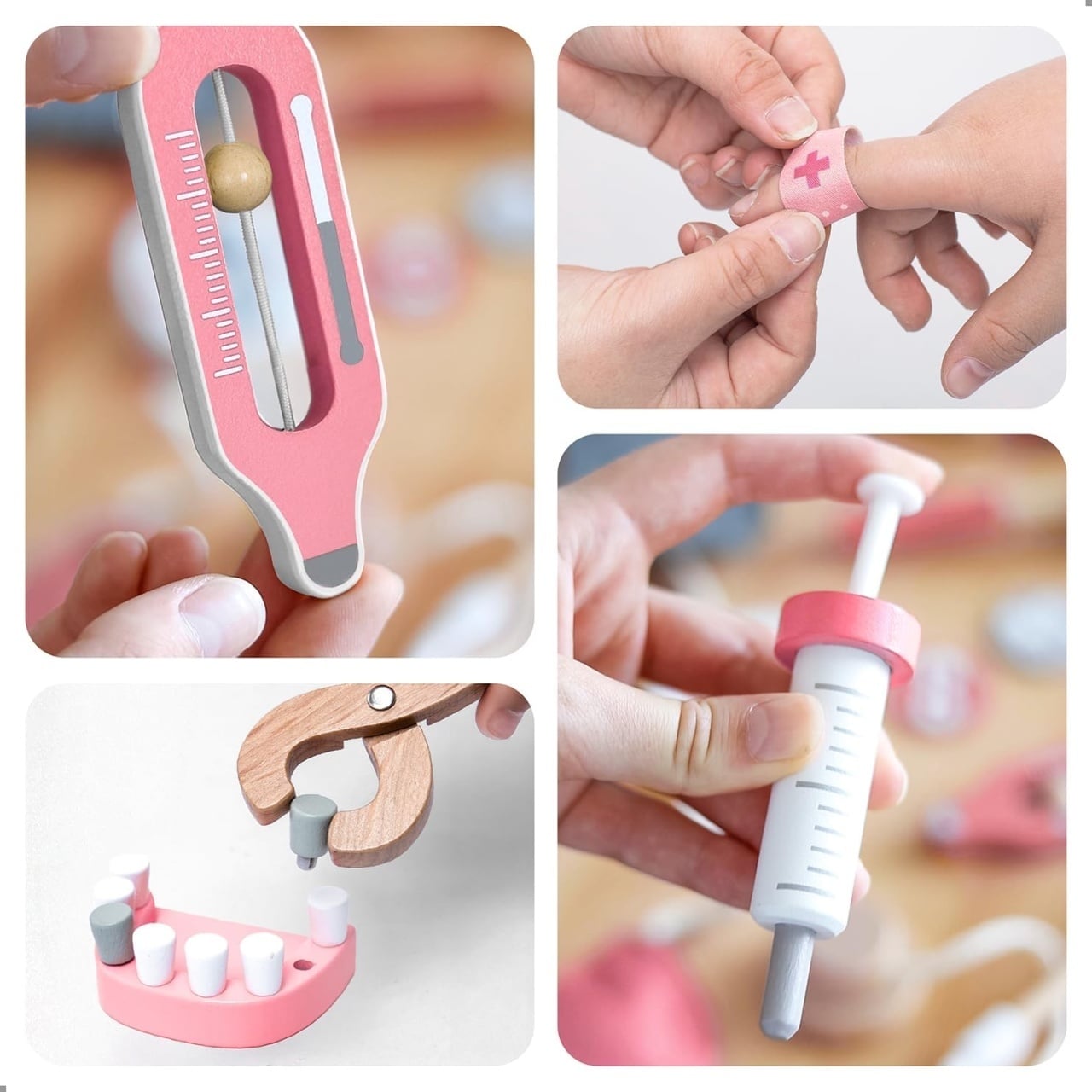 Joc de rol Trusa completa de doctor, roz, UMU Toys Un joc de rol educativ pentru micii medici în devenire – cu un design modern și culori atractive! Trusa include tot ce are nevoie un doctor mic pentru a îngriji pacienții imaginari: stetoscop, termometru, ecuson personalizat, model dentar și multe altele. Copiii pot învăța despre corpul uman, grija față de ceilalți și importanța sănătății, prin joacă activă și plină de sens. Halatul alb cu detalii roz, boneta și rucsacul medical transformă fiecare copil într-un „adevărat” doctor. Joaca devine interactivă, iar imaginația lor capătă sens și direcție. Rucsacul funcționează și ca geantă de transport, cu compartimente pentru fiecare instrument. Piesele sunt fabricate din lemn și textil, cu margini rotunjite, fiind sigure și rezistente. Totul este gândit pentru siguranță, confort și distracție maximă. Cadoul potrivit pentru micii exploratori curioși, cu ocazia Crăciunului, Paștelui sau zilei de naștere. Setul conține 20 de piese: halat de doctor (cu cordon reglabil), bonetă, ecuson, stetoscop, tensiometru, seringă, termometru, plasturi, pensetă, periuță de dinți, model dentar, ciocănel reflexe, lupă, spatulă, pastile, card de identificare, rucsac cu bretele ajustabile. Vârsta recomandată: 3–6 ani (mărime halat 98–116 cm) 🌱 Realizat din lemn, textil și plastic prietenos cu mediul, vopsele pe bază de apă. Conform EN71 & ASTM, certificat CE AVERTISMENT: Contraindicat copiilor sub 3 ani. Necesită supravegherea unui adult în timpul jocului. Produs în China pentru UMU Toys, Cehia.*Durata de livrare a produselor de 1-2 zile lucratoare poate fi oferita in perioadele cu volum scazut de comenzi si in conditii de disponibilitate a produselor. Termenul se poate prelungi pana la 30 de zile conform prevederilor legale de livrare a comenzilor plasate online.