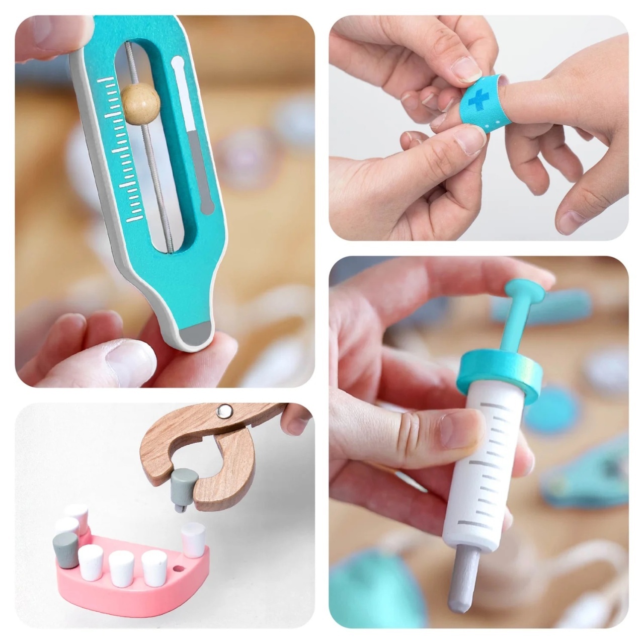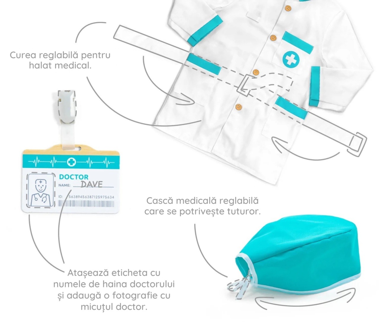 Joc de rol Trusa completa de doctor, turcoaz, UMU Toys Un joc de rol educativ pentru micii medici în devenire – cu un design modern și culori atractive! Trusa include tot ce are nevoie un doctor mic cu inimă mare pentru a îngriji pacienții imaginari: stetoscop, termometru, ecuson personalizat, model dentar și multe altele. Copiii pot învăța despre corpul uman, grija față de ceilalți și importanța sănătății, prin joacă activă și plină de sens. Halatul alb cu detalii turcoaz, boneta și rucsacul medical transformă fiecare copil într-un „adevărat” doctor. Joaca devine interactivă, iar imaginația lor capătă sens și direcție. Rucsacul funcționează și ca geantă de transport, cu compartimente pentru fiecare instrument. Piesele sunt fabricate din lemn și textil, cu margini rotunjite, fiind sigure și rezistente. Totul este gândit pentru siguranță, confort și distracție maximă. 🎁 Cadoul potrivit pentru micii exploratori curioși, cu ocazia Crăciunului, Paștelui sau Zilei Copilului. Setul conține 20 de piese: halat de doctor (cu cordon reglabil), bonetă, ecuson, stetoscop, tensiometru, seringă, termometru, plasturi, pensetă, periuță de dinți, model dentar, ciocănel reflexe, lupă, spatulă, pastile, card de identificare, rucsac cu bretele ajustabile. Vârsta recomandată: 3–6 ani (mărime halat 98–116 cm) 🌱 Realizat din lemn, textil și plastic prietenos cu mediul, vopsele pe bază de apă. Conform EN71 & ASTM, certificat CE AVERTISMENT: Contraindicat copiilor sub 3 ani. Necesită supravegherea unui adult în timpul jocului. Produs în China pentru UMU Toys, Cehia.*Durata de livrare a produselor de 1-2 zile lucratoare poate fi oferita in perioadele cu volum scazut de comenzi si in conditii de disponibilitate a produselor. Termenul se poate prelungi pana la 30 de zile conform prevederilor legale de livrare a comenzilor plasate online.