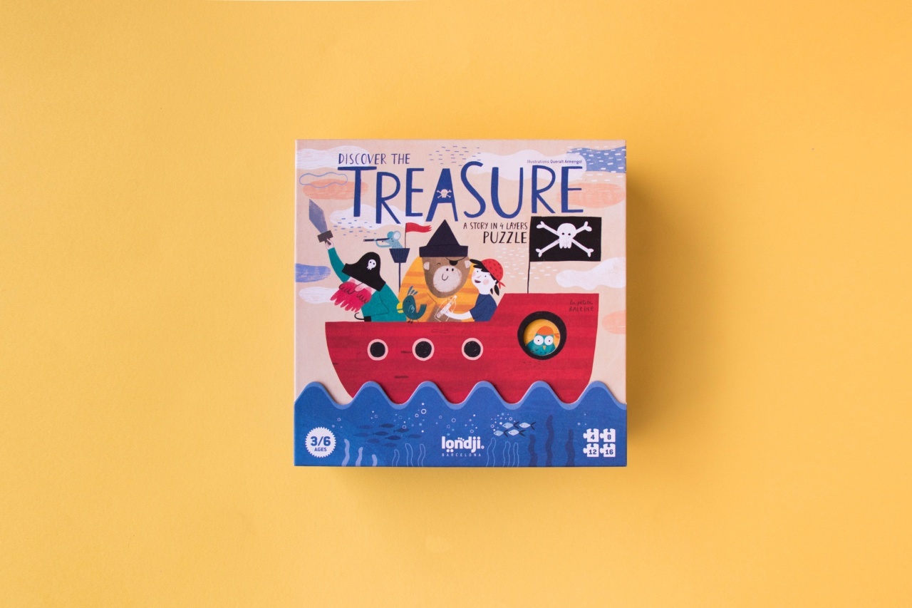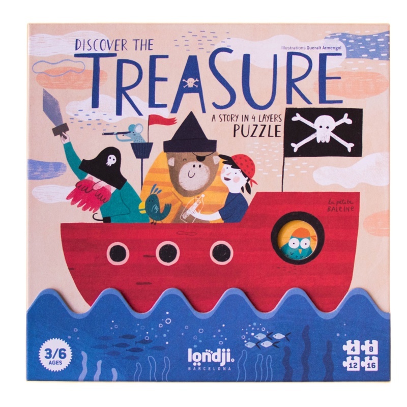 Puzzle Comoara ascunsa – descopera misterul! Ce mesaj în sticlă ne-a lăsat sirena? Copilul va afla povestea piraților și va descoperi comoara ascunsă pe fundul mării completând acest puzzle fascinant! Setul conține 4 puzzle-uri cu tematică pirați și comori , având 4, 8, 12 și 16 piese , care se asamblează în straturi, de la cel mai mare la cel mai mic, oferind o experiență captivantă și interactivă pentru cei mici. Explorați lumea piraților și descoperiți comoara ascunsă! 🏴☠️ 🔹 Ilustrație: Queralt Armengol 🔹 Dimensiune puzzle: 52 x 23,6 cm 🔹 Materiale: Hârtie FSC și carton reciclat 🔹 Vârstă recomandată: 3-6 ani 🔹 Fabricat în Barcelona Avertisment! Nu este potrivit pentru copiii sub 3 ani. Conține piese mici. Produs de Londji.*Durata de livrare a produselor de 1-2 zile lucratoare poate fi oferita in perioadele cu volum scazut de comenzi si in conditii de disponibilitate a produselor. Termenul se poate prelungi pana la 30 de zile conform prevederilor legale de livrare a comenzilor plasate online.