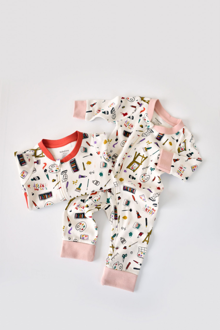 Set 2 salopetele cu maneca lunga si pantaloni lungi cu fermoar - 100%bumbac organic - Portocaliu si Pudra, BabyCosy