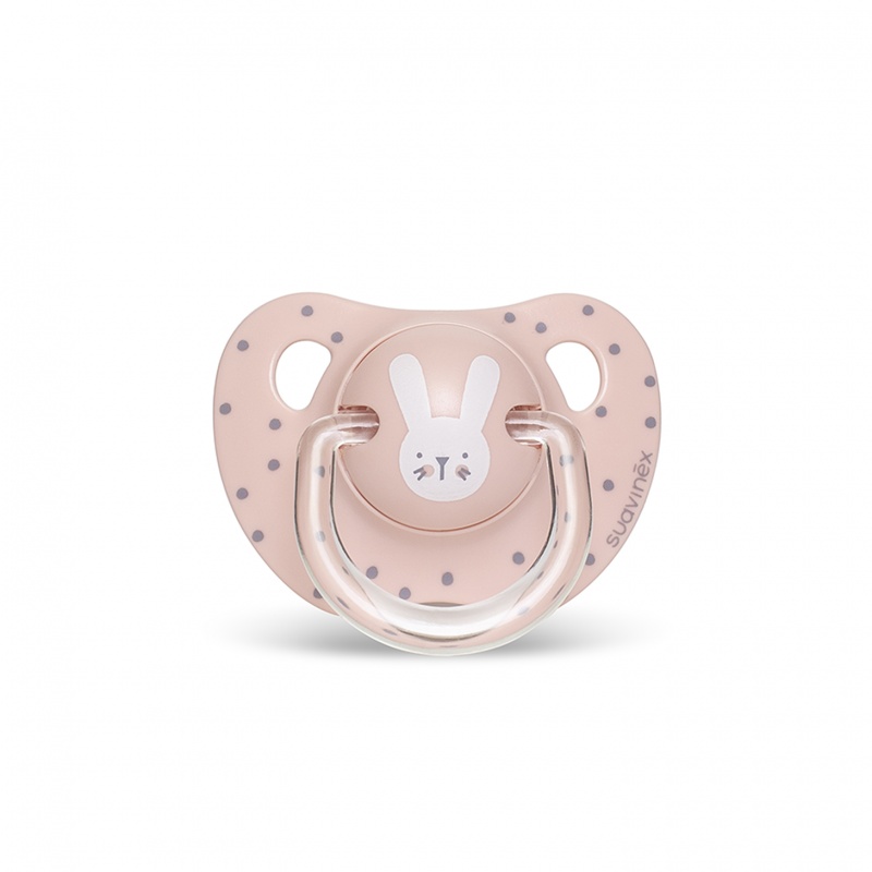 Suzeta cu tetină din silicon, recomandată pentru bebeluși de la 18 luni, are o formă anatomică ce imită mamelonul în timpul alăptării, adaptându-se confortabil la bolta palatină a bebelușului.