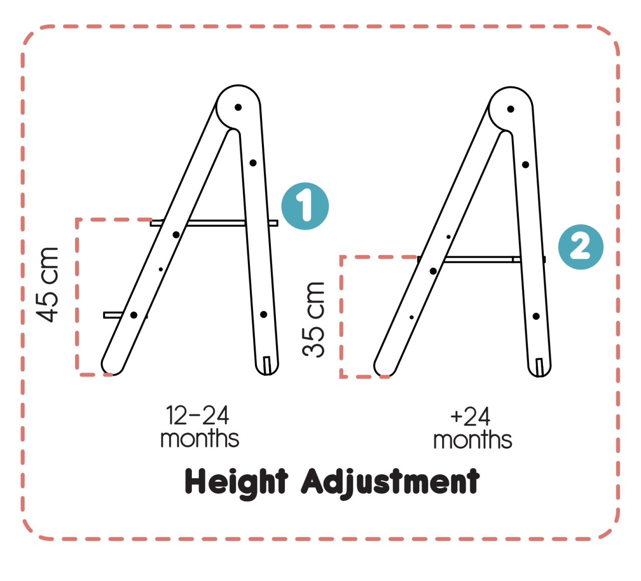 Inaltime reglabila: platforma reglabila pe care sta copilul are opritor pentru un plus de siguranta si pentru a preveni alunecarea acesteia in afara turnului; 2 poziti de inaltine de la 35 la 45 cm.